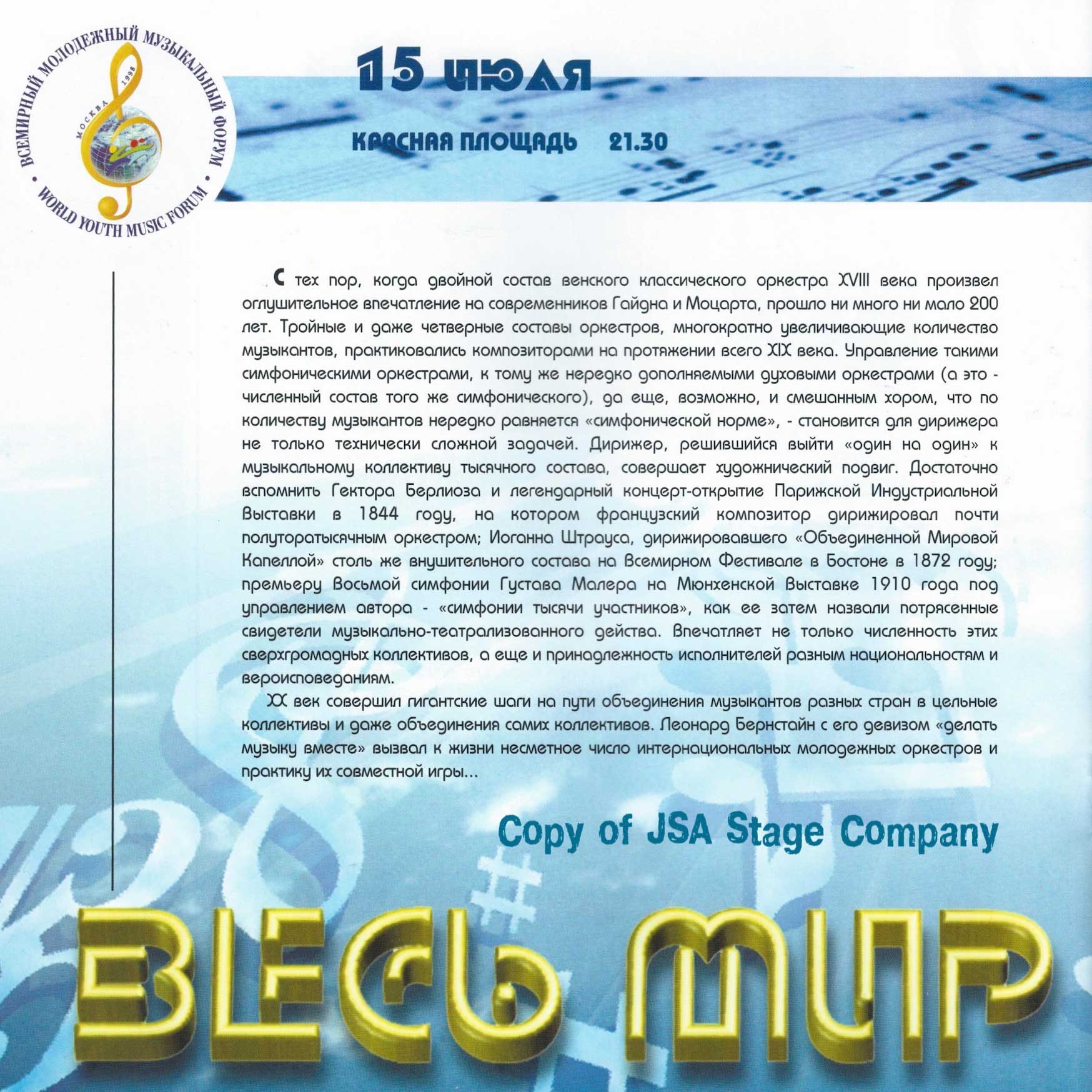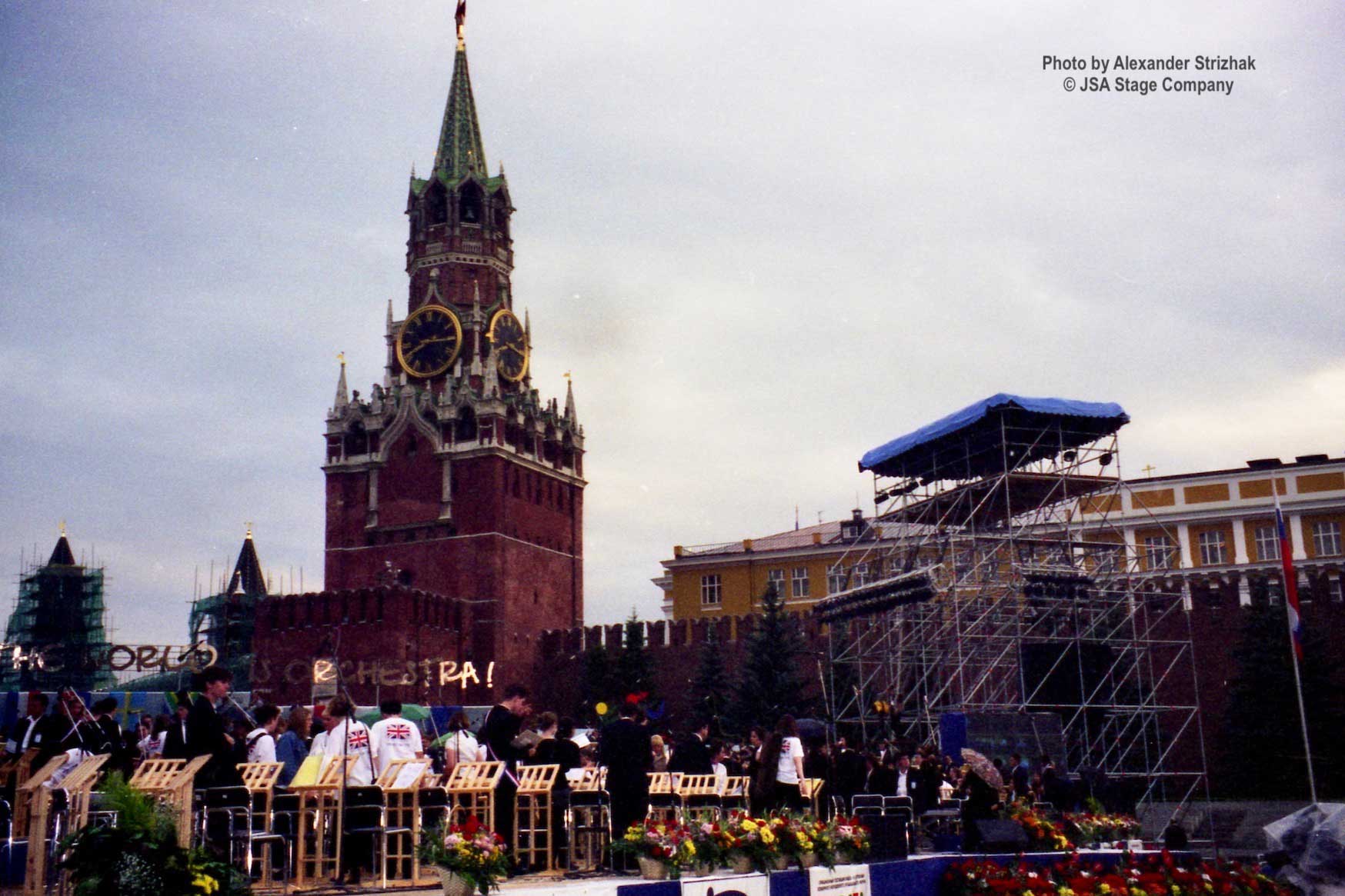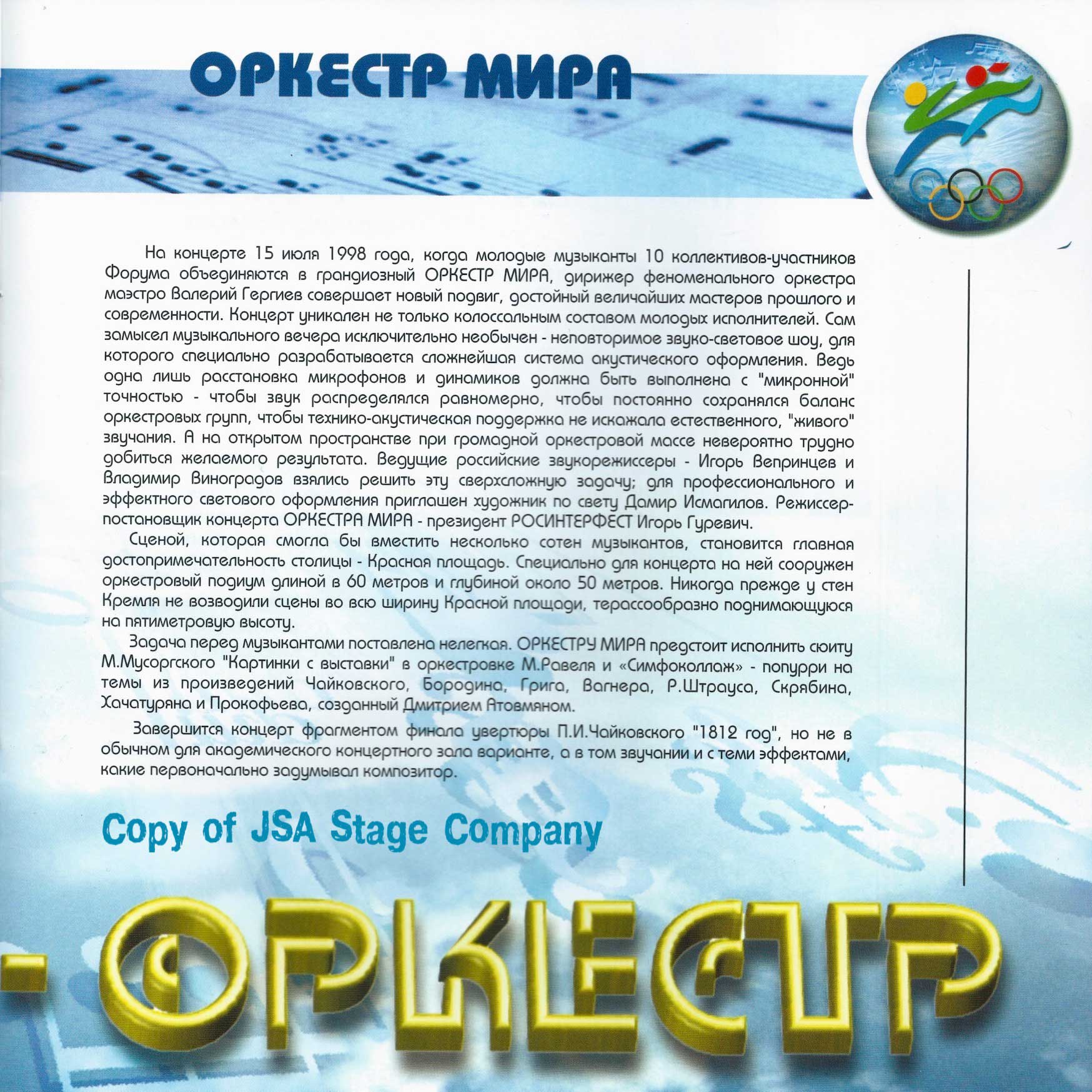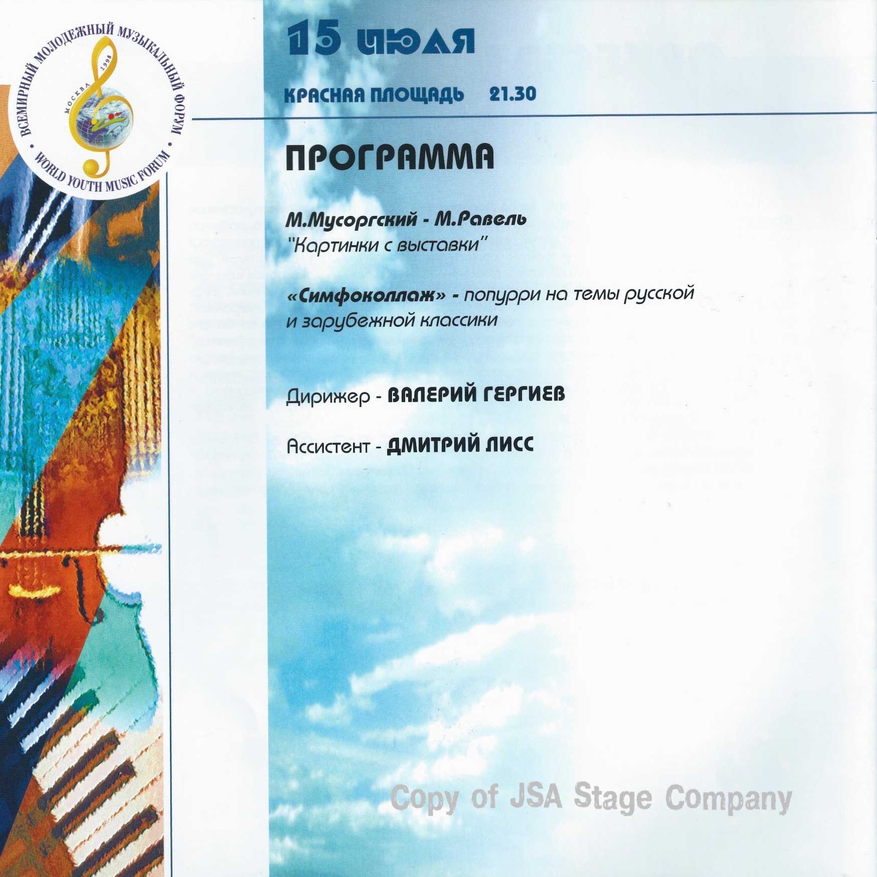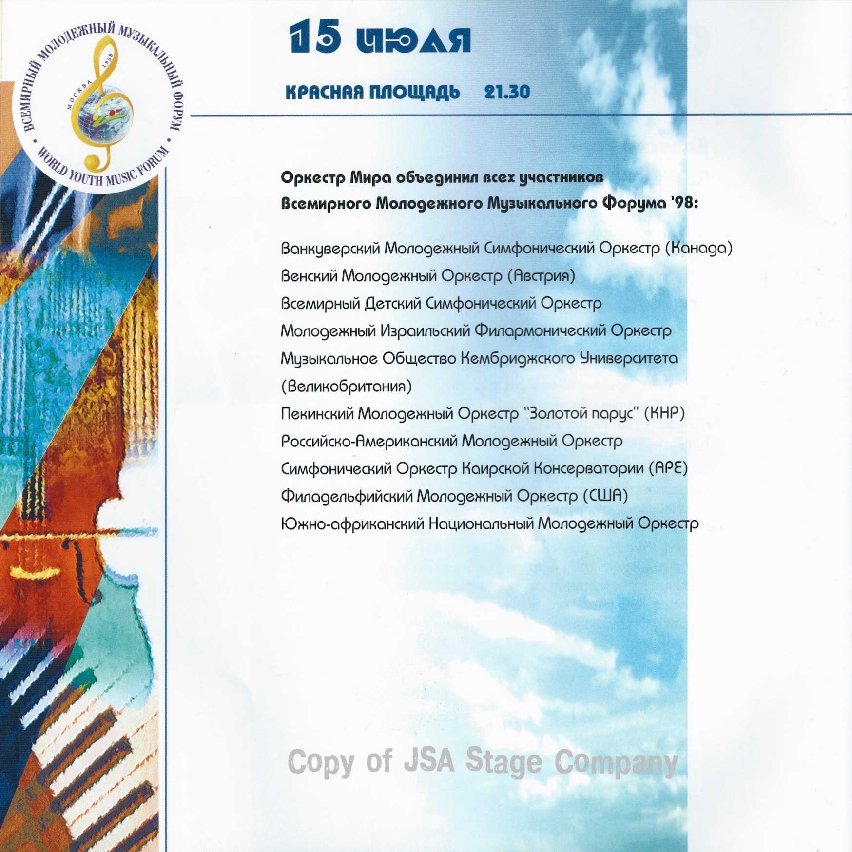 15 июля 1998 года на Красной площади в Москве состоялся уникальный концерт “Оркестра Мира”. Одновременно на сцене выступило 850 молодых музыкантов из 60 стран мира — участников Всемирного Молодежного Музыкального Форума. Дирижировал этим необычным оркестром — Валерий Гергиев. В программе концерта прозвучали произведения Мусоргского, Чайковского, Вагнера, Грига, Р. Штрауса, Бородина, Хачатуряна, Скрябина и др… Масштабное событие прошло на гигантской сцене, которую установила компания JSA, специально для этого случая.