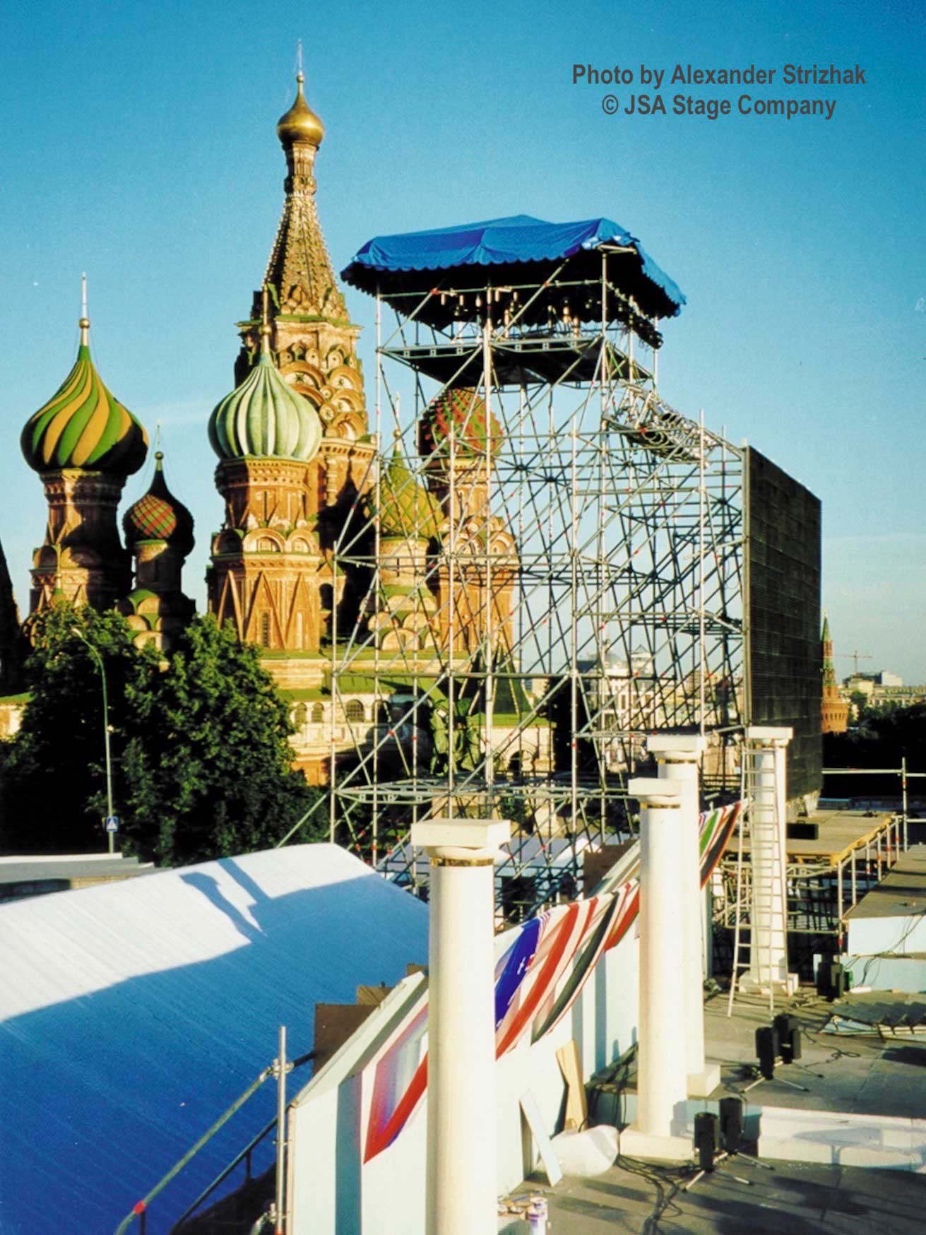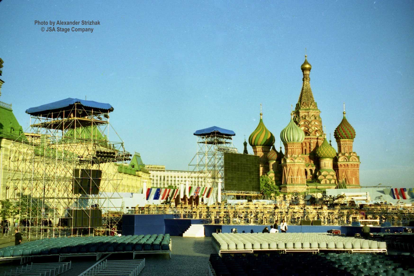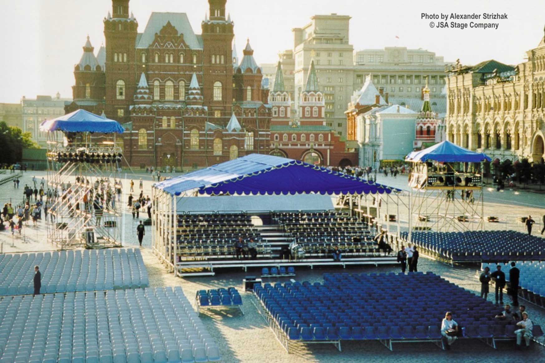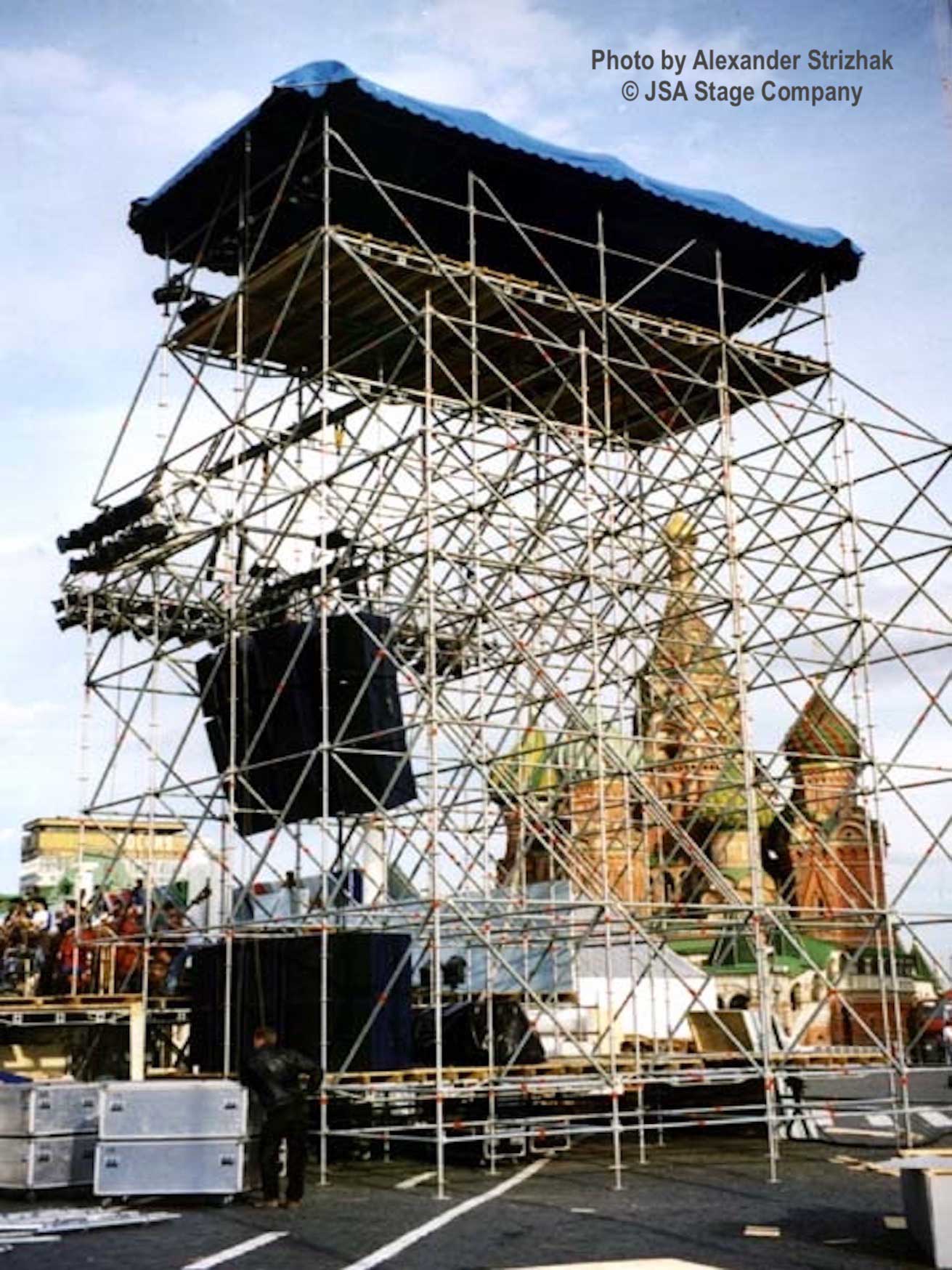 На главной площади столицы России была установлена многоуровневая сценическая платформа общей площадью 2400 квадратных метров. Структура собранная из элементов системы Layher Allround Scaffolding и деревянных щитов для покрытия пола, протянулась поперёк всей исторической площади. Также JSA установила шесть специальных башен для подвеса звукового оборудования и световых приборов. Высота башен была от 12 до 16 метров. На одной из главных башен по фронту был установлен светодиодный экран, для трансляции концерта и показа нужной информации. За сценой был установлен большой тентовый павильон для хранения инструментов и подготовки музыкантов к выходу на сцену.