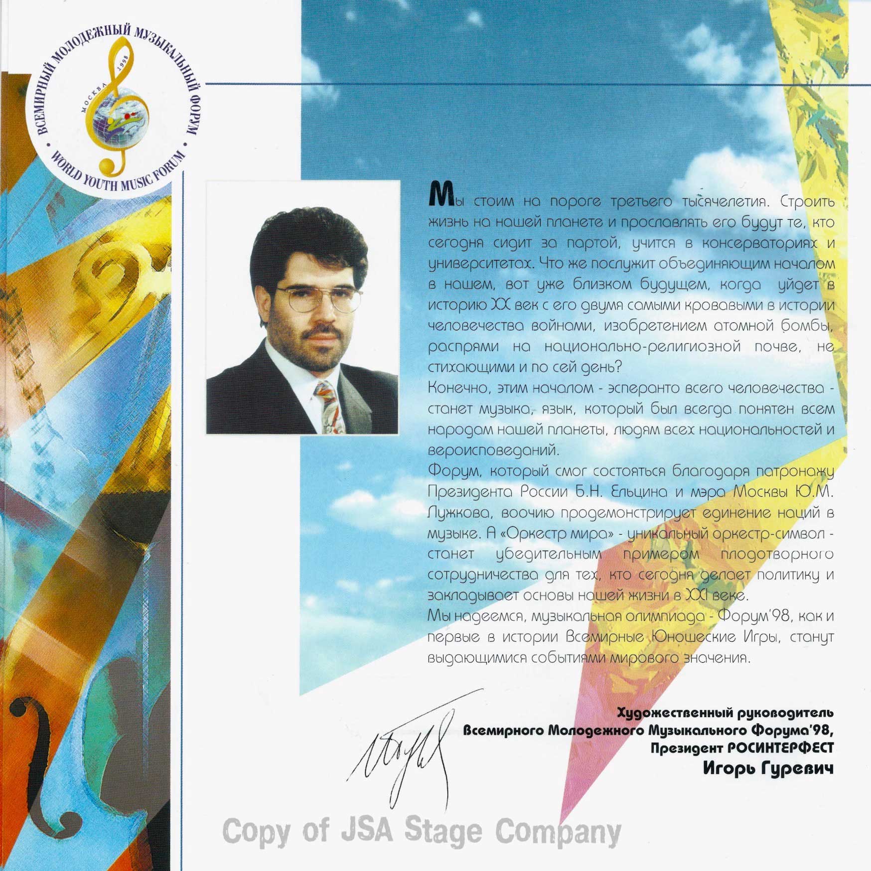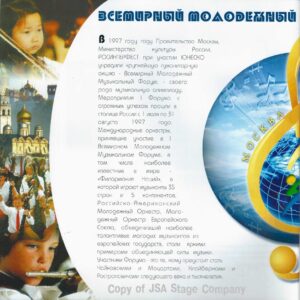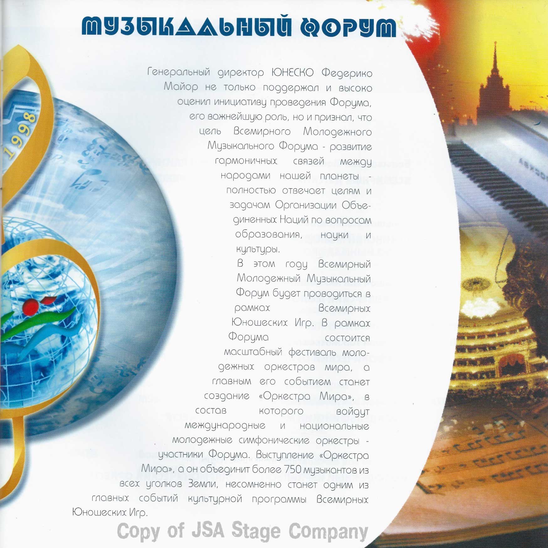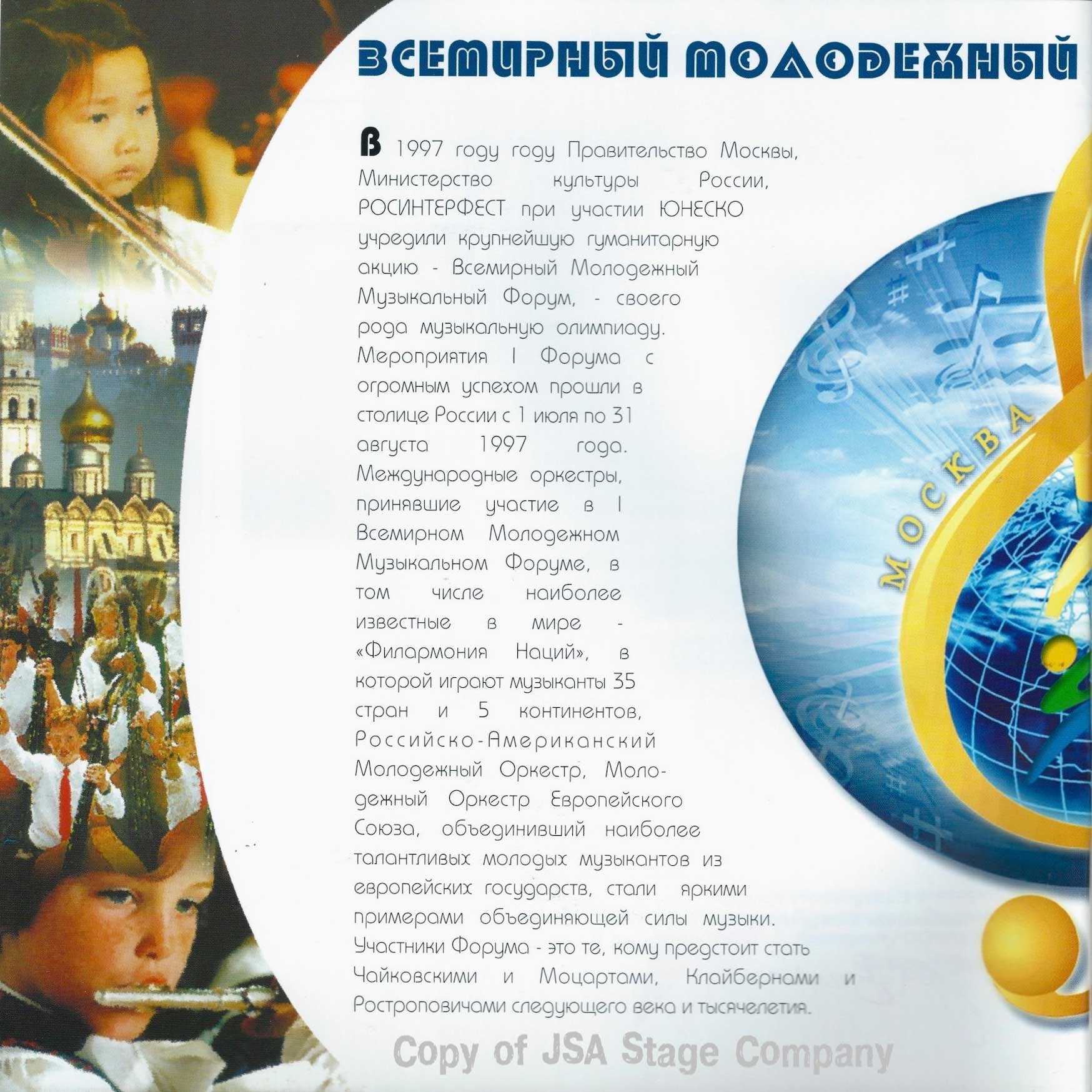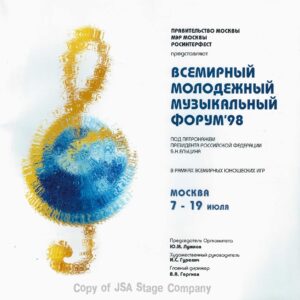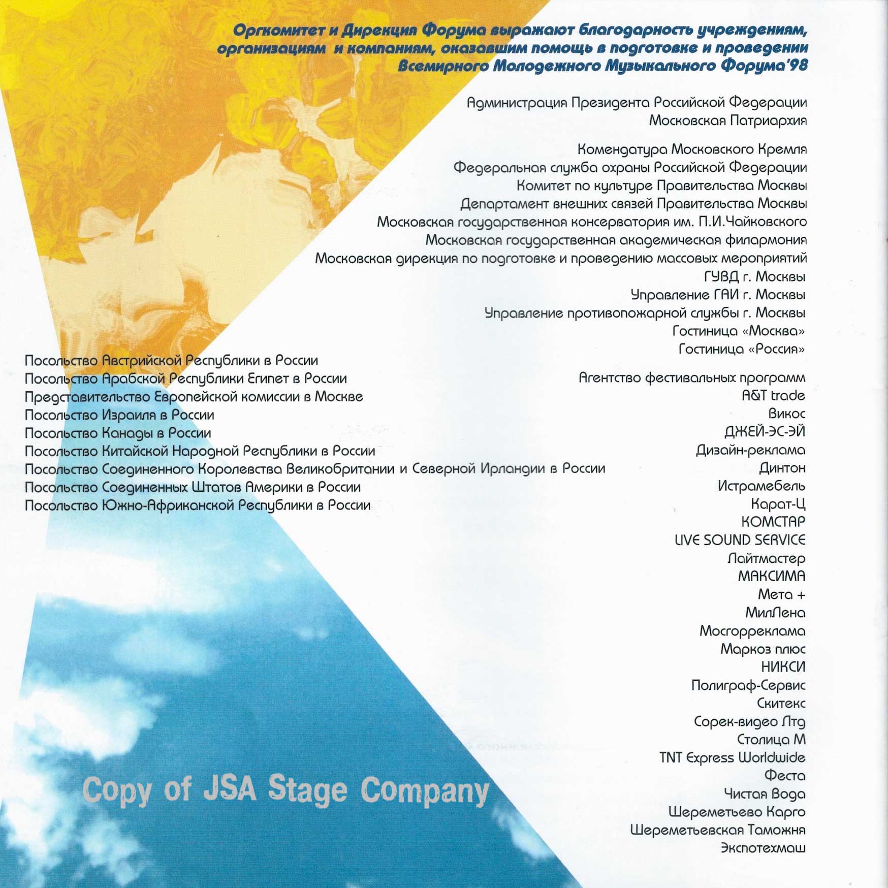 Больше информации о Всемирном Молодёжном Музыкальном Форуме 1998, об организаторах, людях и компаниях принимавших участие в подготовке и проведению этого культурного события смотрите на страницах официального рекламного буклета Форума опубликованных ниже: