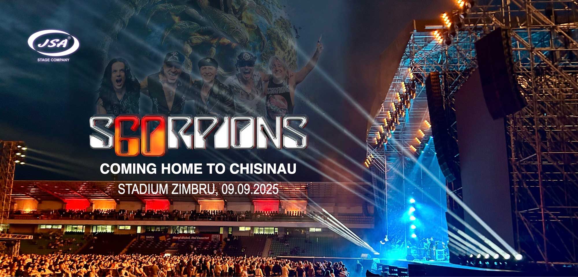 09 сентября 2025 года на стадионе “Зимбру” (Stadionul Zimbru) в столице Молдовы состоялся концерт знаменитой группы СКОРПИОНС. Выступление популярных рок музыкантов прошло в рамках их юбилейного тура в честь 60 летия основания коллектива. Этот тур носит название “Возвращение домой в ….” и в каждом городе в рекламе шоу добавляется его название. Поэтому это выступление имело название на английском: “Coming Home to Chisinau” или „Întoarcerea acasă la Chișinău” (на молдавском). Компания JSA приняла участие в установке сценической конструкции для этого события.