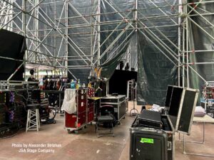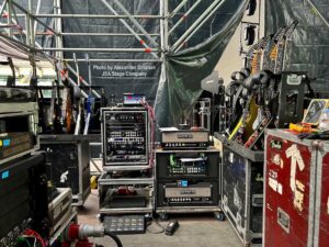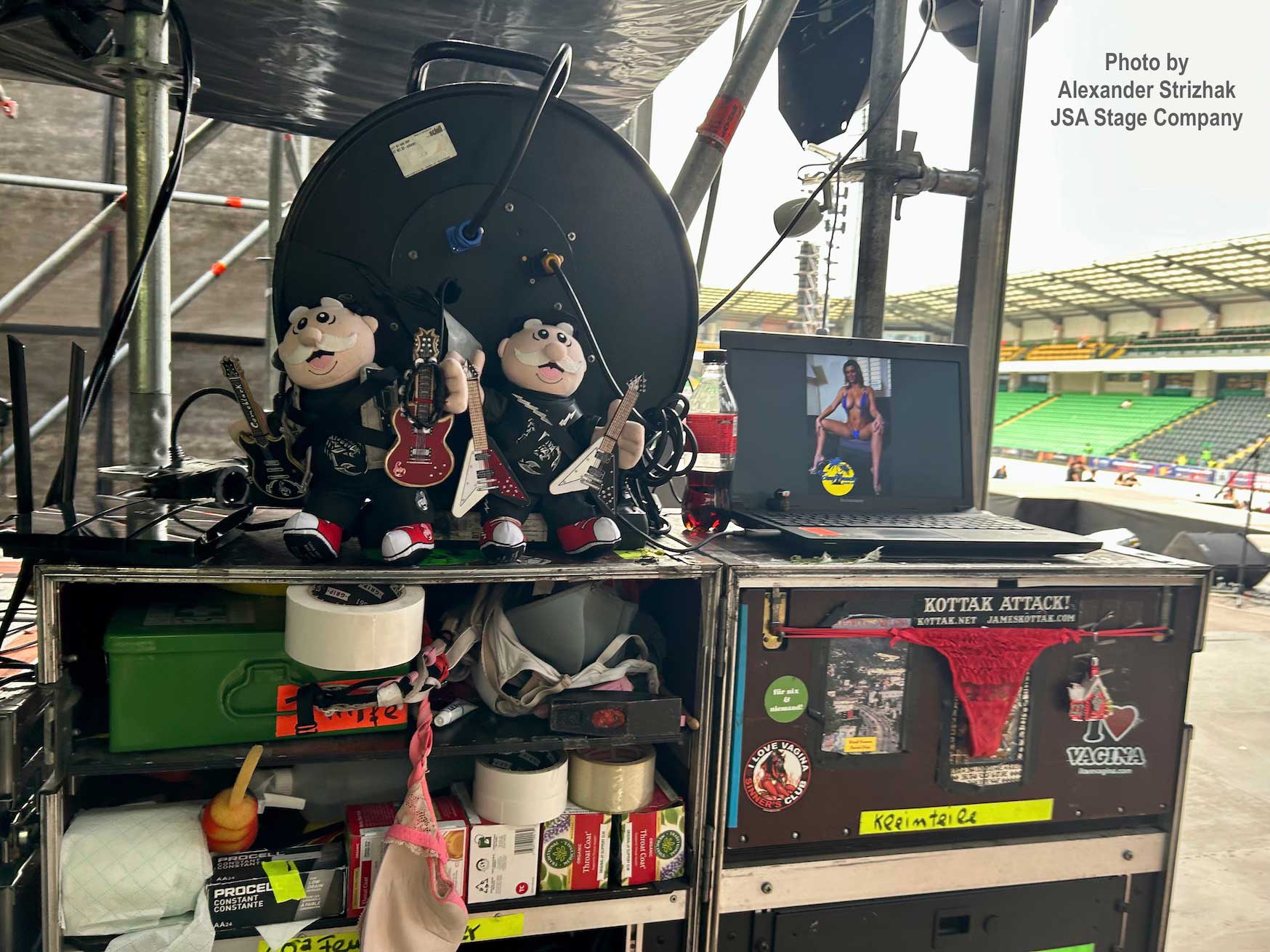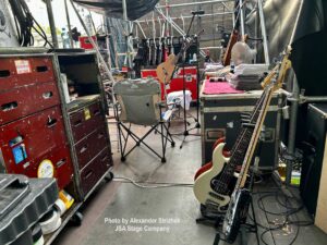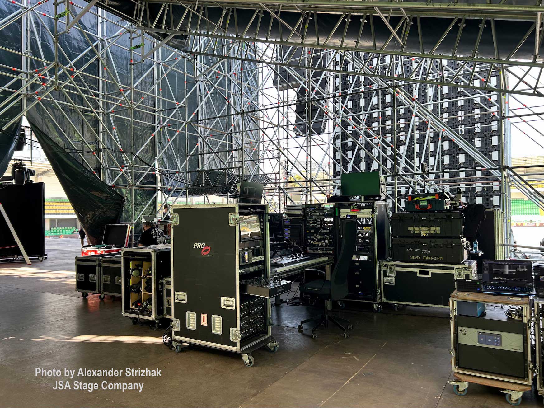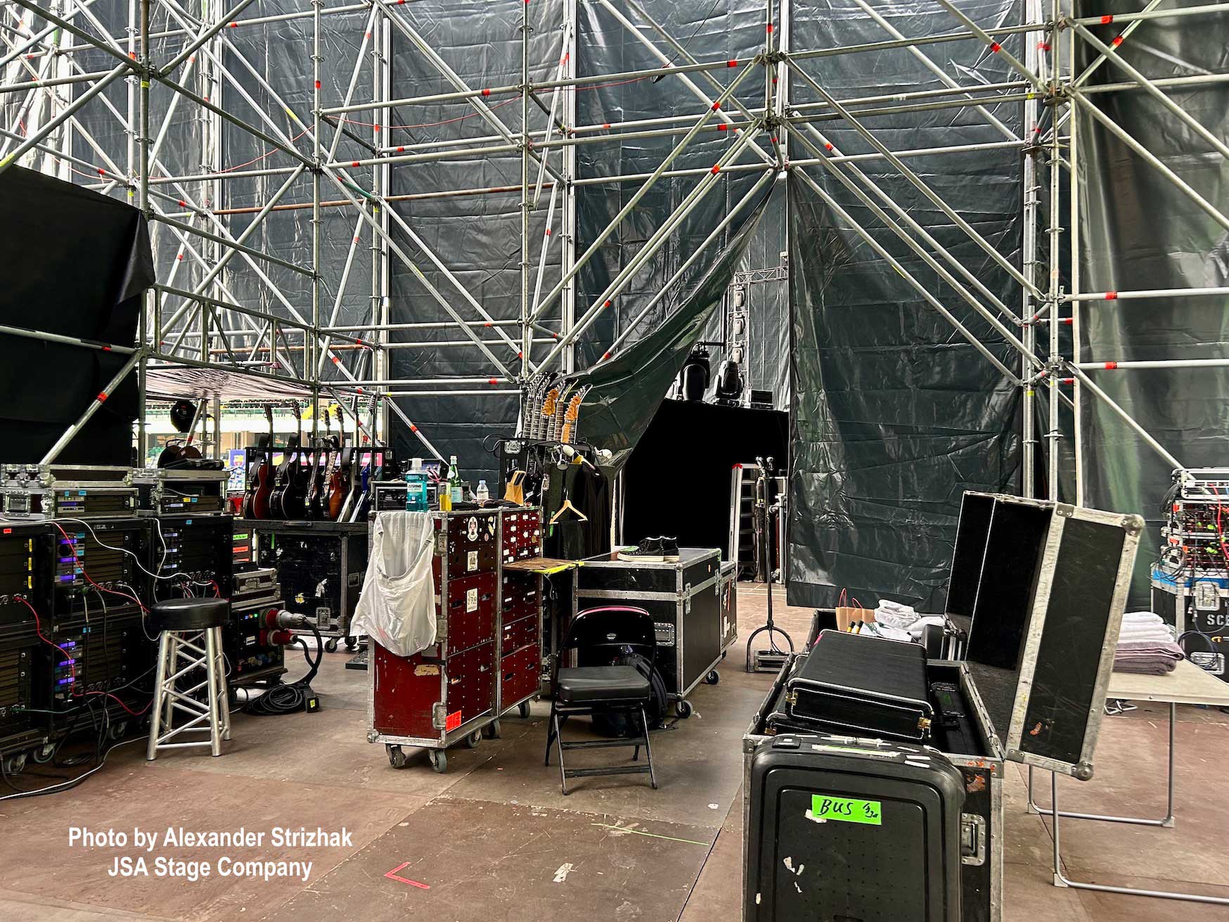 Несколько “секретных” снимков из зоны бекстейдж, “кухни” музыкантов, их помощников и техников. Всегда любопытно посмотреть — что там бывает. Для создания закулисного пространства в структуре сцены были установлены боковые платформы с навесами.