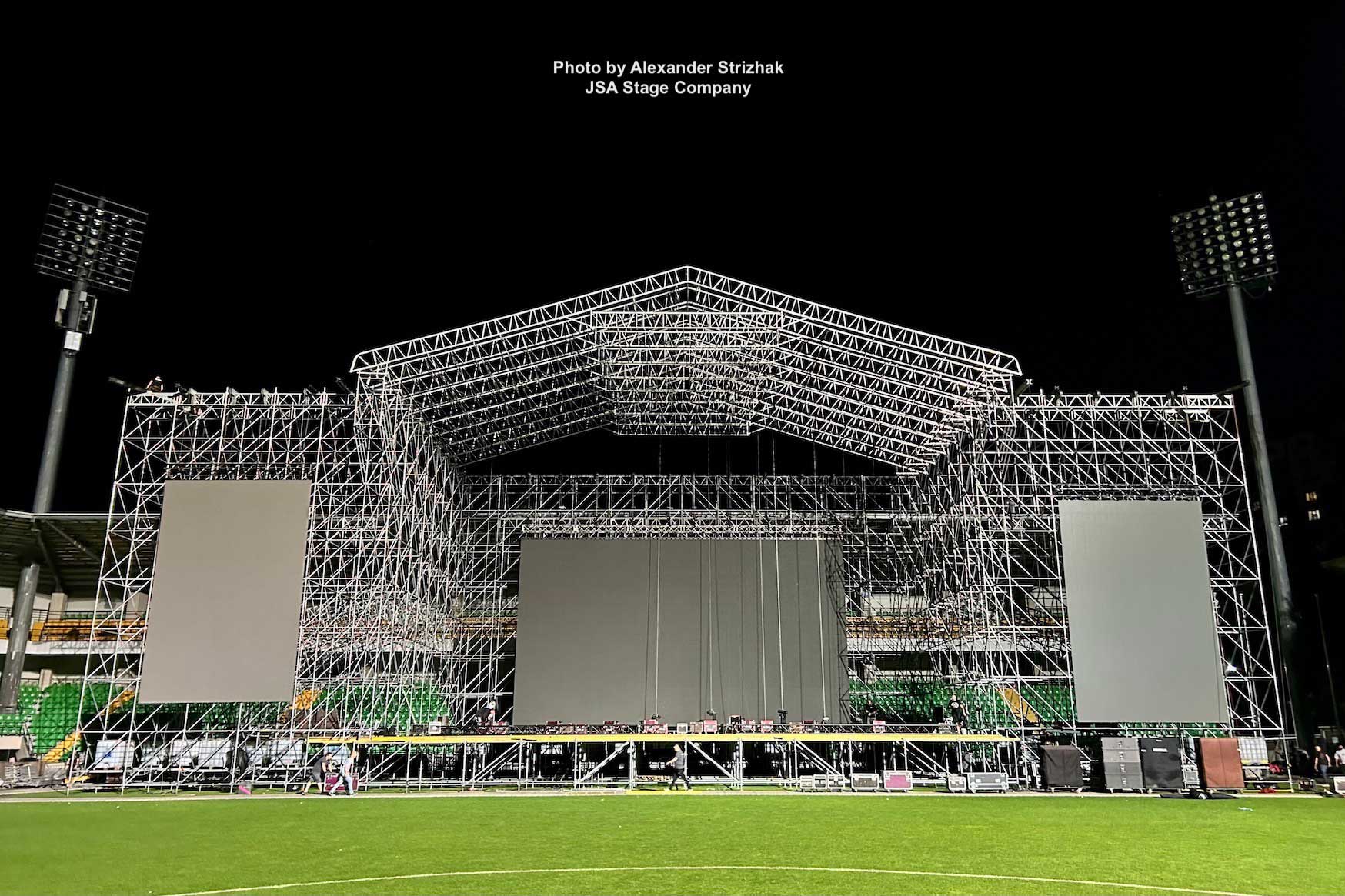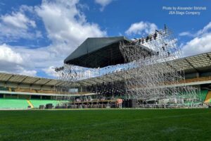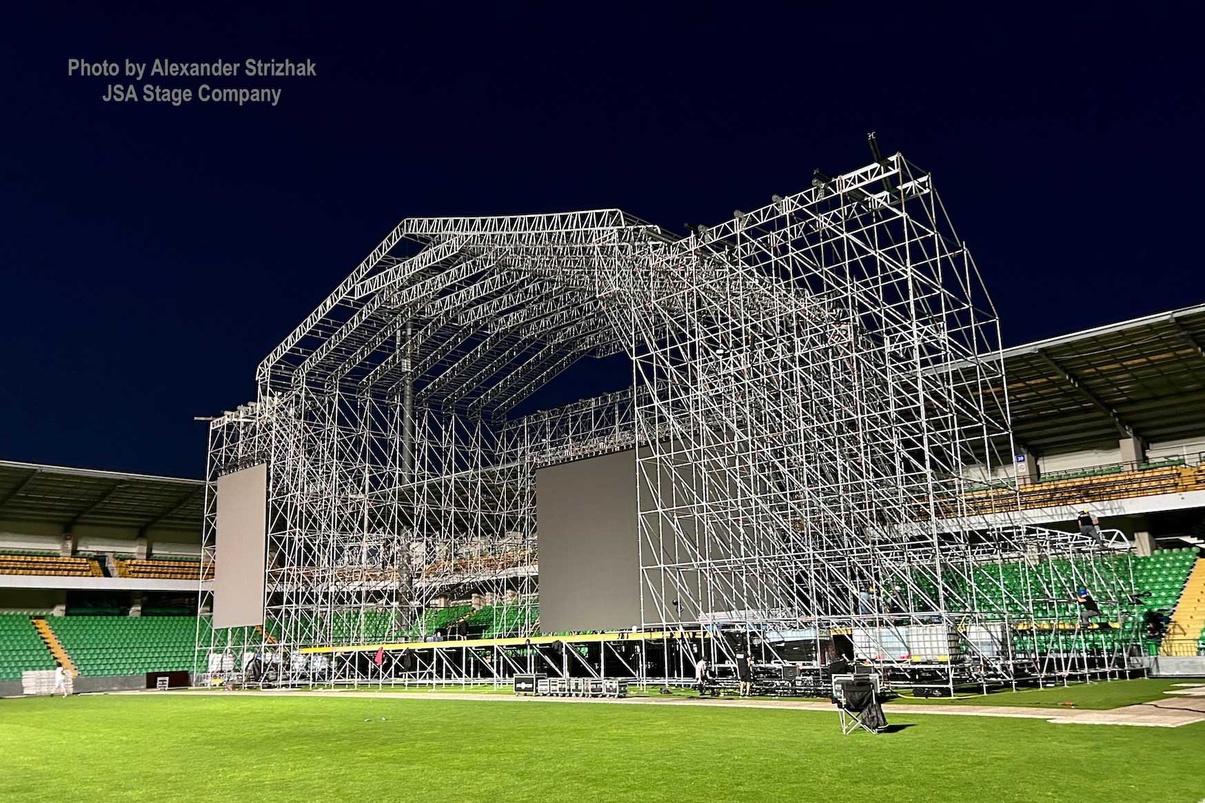Монтаж сцены, башен и другого оборудования (свет, звук, экраны) происходил достаточно в короткие сроки и при особых условиях, так работа на футбольном поле требовало соблюдение определённых правил и графика, связанного с его покрытием и сохранением для последующих матчей. Крышная система устанавливалась с помощью специального уникального крана.